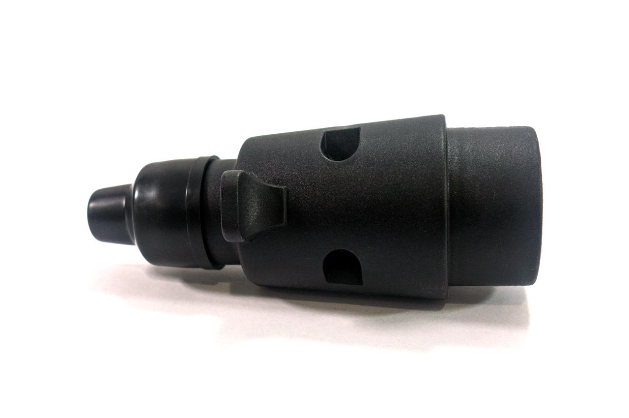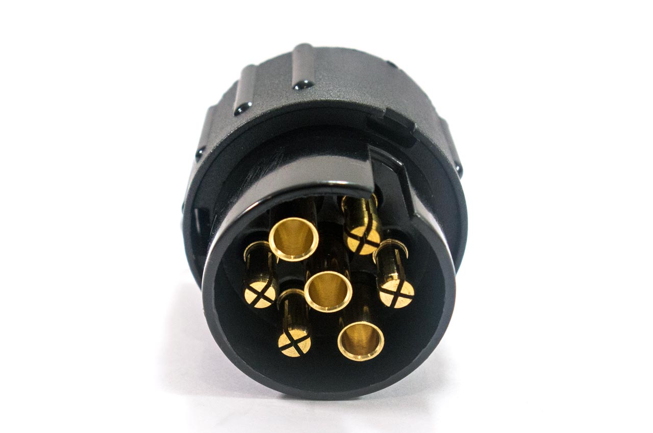 Fisa remorca cu 7 pini. Priza este universală, deci se potrivește la orice tip de remorci ușoare, platforme auto, etc. Carcasa este din plastic. Este echipată cu conector de 12 V și cu pini din metal antioxidant.