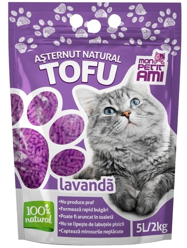 Asternut igienic natural pentru pisici, din tofu, 100% absorbant, biodegradabil, parfum lavanda, 5 L/2 kg