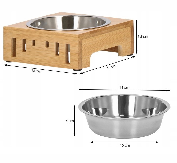 Castron, bol, pentru caine, pisica, cu suport, bambus, metal, inox, 14 cm