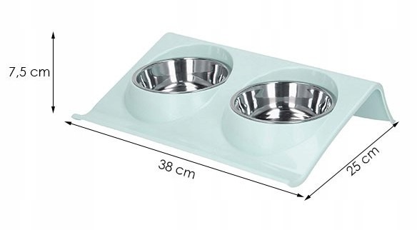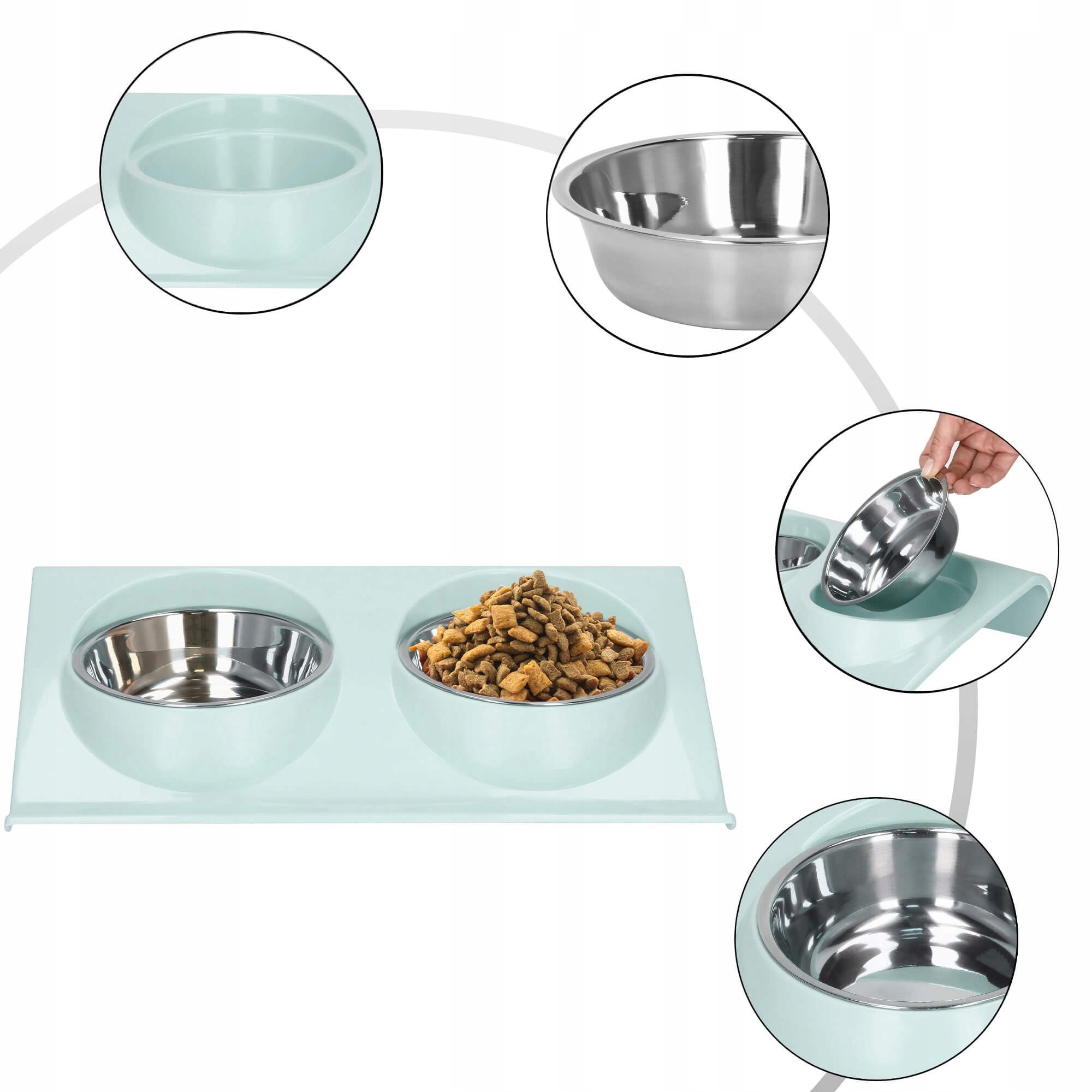 Castron, bol, pentru caine, pisica, dublu, cu suport, inox si plastic, albastru, 2 x 14 cm