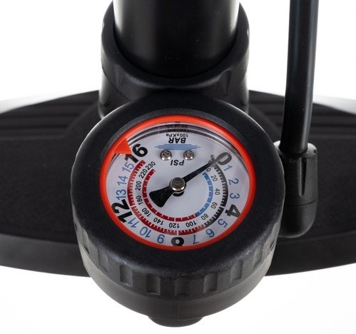 - Bara incorporata si maner PSI – pompa are un manometru incorporat, astfel incat sa stiti cand sa opriti pomparea . Presiunea maxima pe manometru este de 16 bar / 230 PSI.