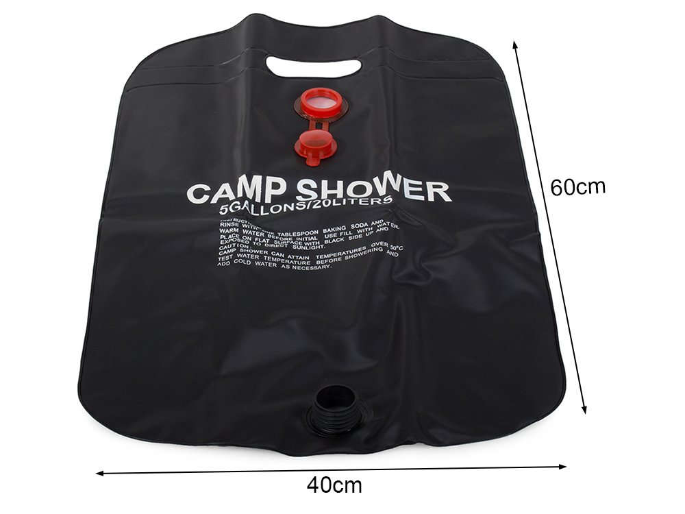 - Sacul este colorat in negru astfel incat apa sa se incalzeasca mai repede si este echipat cu un furtun cu duza de dus si un tub pe fare poate fi agatat dusul.
