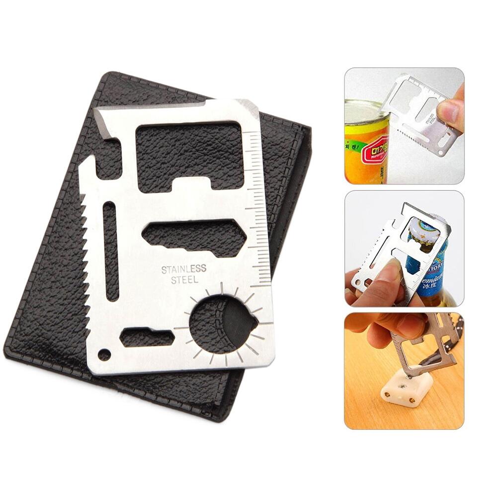 - Cardul de supravietuire este un articol mic care combina pana la 11 functii esentiale pentru supravietuire. Poate juca rolul a mai multor instrumente cum ar fi: fierastraul, cheia tip fluture, deschizatorul de conserve, cutit, deschizatorul de sticle, surubelnita cu cap plat, banda de masurare, cheie inelara de 6 mm, 7 mm, 8 mm, 10 mm, indicatorul de harta, cheia inelara de 4 mm, 5 mm, snur sau gaura pentru cheie.