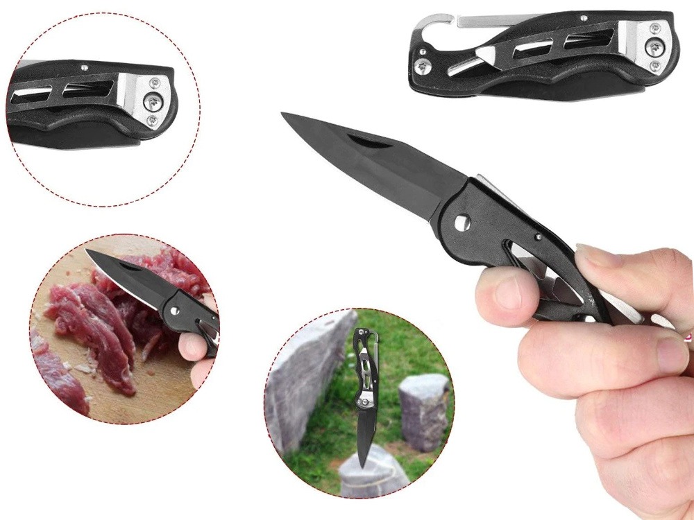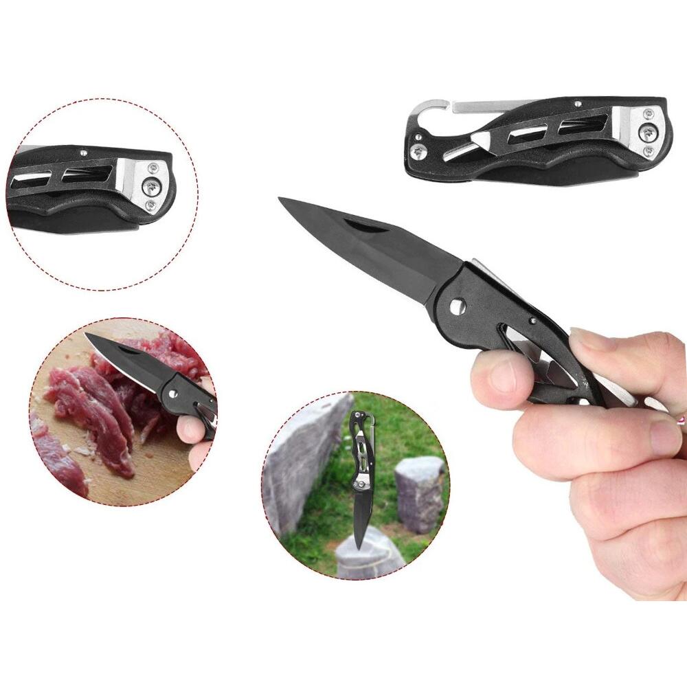 - Trusa include si un cutit de drumetie, care are o lama foarte usoara, dar durabila. Este foarte versatil si va functiona bine atat pentru pregatirea mesei, cat si in alte situatii care necesita taiere ascutita si eficienta. A fost special echipat cu un sistem de blocare a lamei care sporeste siguranta la utilizare si, de asemenea, usureaza munca. Odata ce lama este blocata, o deblocati butonul argintiu. Acest cutit este echipat cu o clema speciala care va va permite sa-l atasati la centura. In acest fel, el va fi intotdeauna la indemana. Lungimea totala a cutitului cand este desfasurat este de 16 cm.