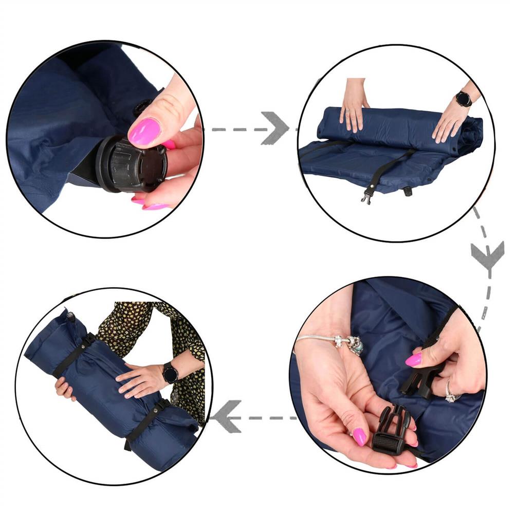 Cu toate acestea, la pliere, desurubati supapa si trageti capacul de langa perna, rulati totul spre supapa, apoi fixati-o si puneti-o intr-o husa.Tesatura din poliester folosita este in sine foarte rezistenta la pete. Daca trebuie sa curatati produsul, stergeti-l usor cu o carpa umeda din microfibra. Nu uitati sa uscati bine salteaua intr-o zona umbrita inainte de a-o rula din nou.