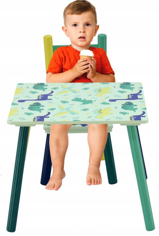 Set mobilier copii, model dinozaur, albastru si verde, lemn + MDF, 50x50x42 cm, Chomik