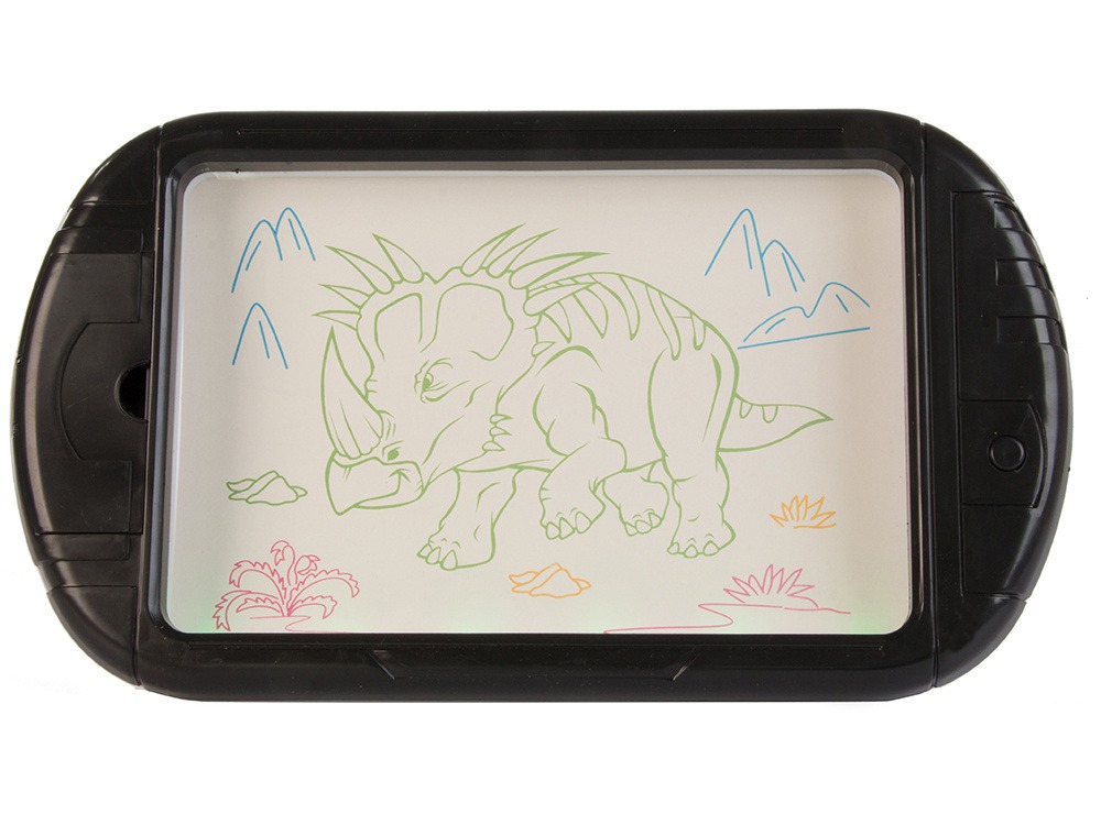 - Tableta are un ecran transparent pentru desen si vine impreuna cu trei markere magice, tip neon.