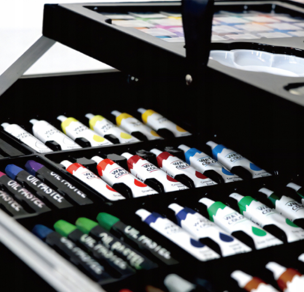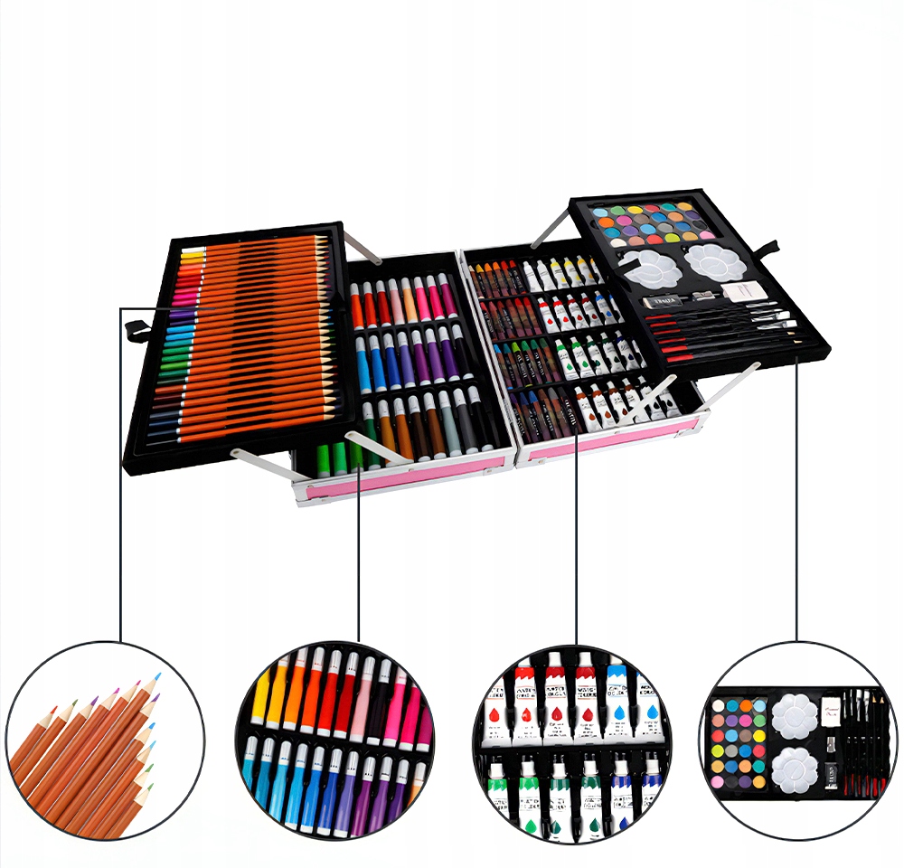 Setul nostru de artă are câte ceva pentru toată lumea – pixuri de colorat , creioane colorate și vopsele de pictură . Toate acestea în culori saturate care arată grozav pe hârtie. Totul este închis într-o valiză confortabilă care poate fi ușor pliată, închisă și luată cu tine – la școală , grădiniță, cursuri de artă sau într -o excursie pentru a picta în aer liber!