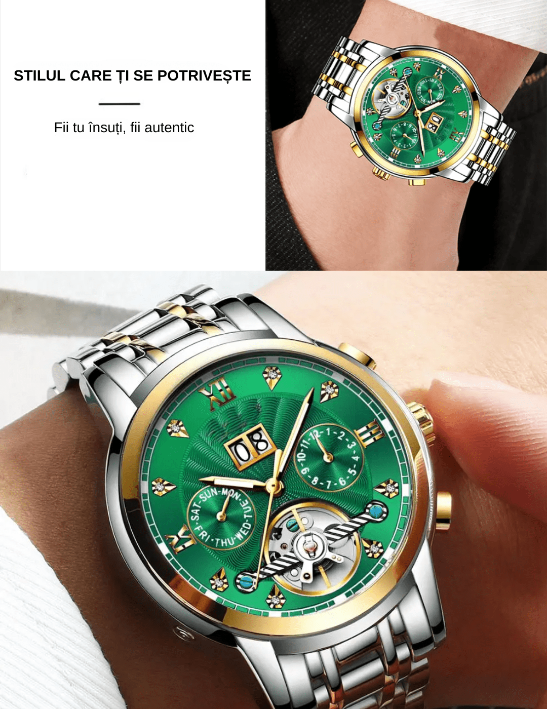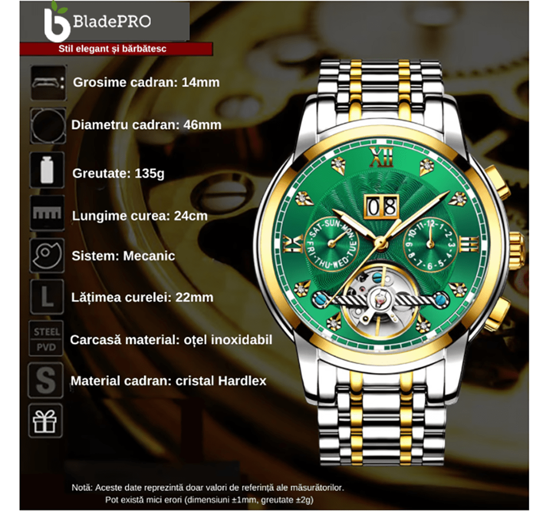 Ceasul mecanic automatic BladePRO Men’s Premium Collection este expresia echilibrului perfect dintre designul luxury si precizia mecanismului clasic. Creat pentru barbatii care apreciaza detaliile rafinate, acest ceas transforma orice tinuta intr-o declaratie de stil.