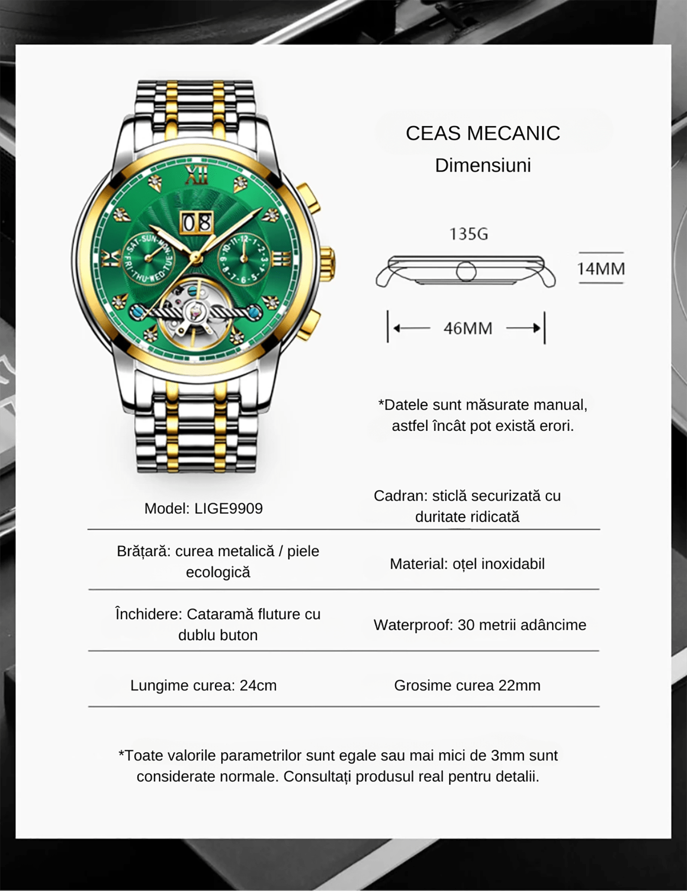 Mecanismul automatic functioneaza fara baterie, fiind alimentat de miscarea naturala a mainii, oferind autenticitate si fiabilitate pe termen lung.