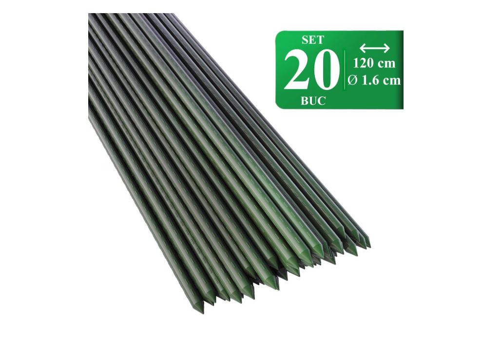 Setul de 20 araci de gradina BladePRO®, realizati din metal rezistent acoperit cu PVC, este solutia ideala pentru sustinerea plantelor de gradina si solar: rosii, castraveti, fasole, mazare, ardei sau flori cataratoare.