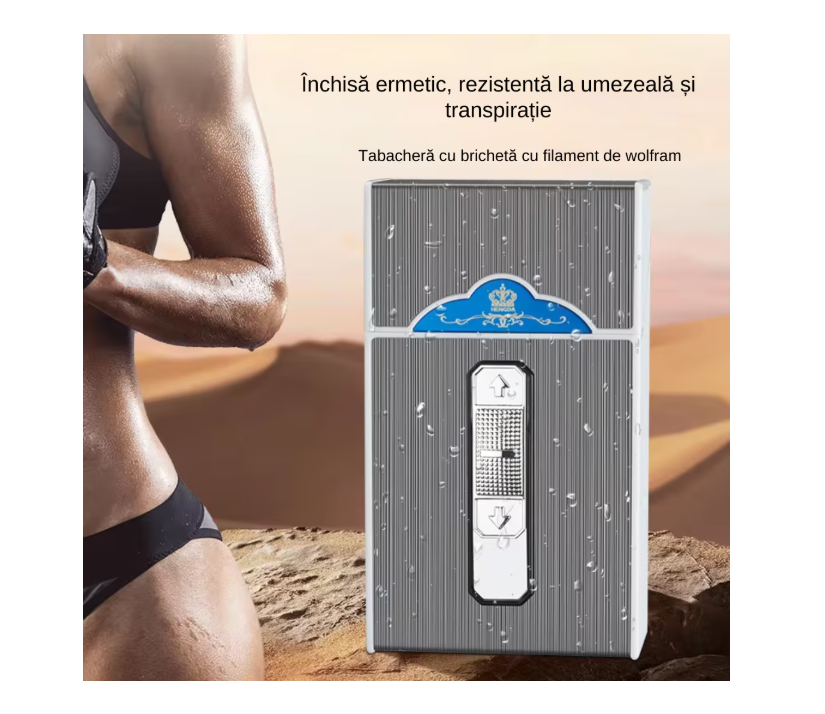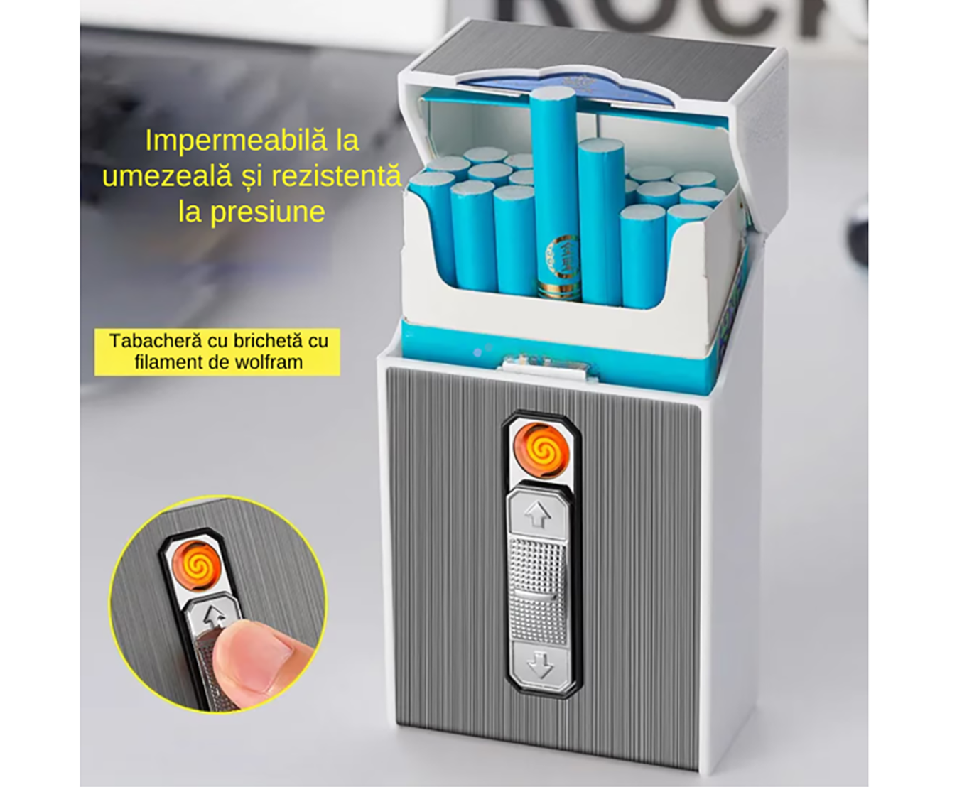 Construita din aliaj de zinc si ABS rezistent, tabachera ofera protectie excelenta tigarilor impotriva umezelii, deformarii sau deteriorarii. Suprafata metalica argintie adauga un plus de rafinament, potrivita pentru buzunar, masina sau birou.