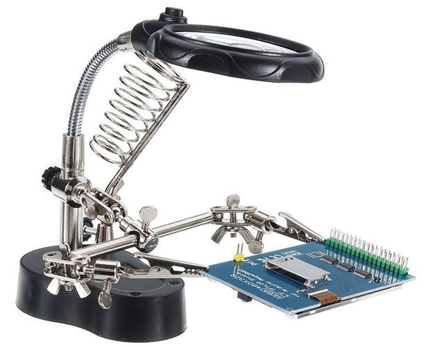 Suport universal pentru lipit cu lupa, LED, 2 brate, 3xAA, 28 cm