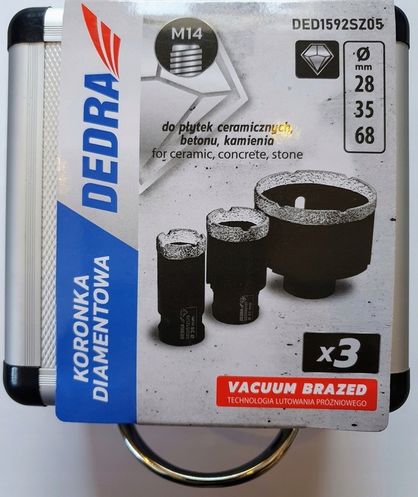 Carota diamantata, vacuum brazed, pentru otel, placi ceramice, sticla, piatra, taiere umeda si uscata, M14, set 3 buc, 28/35/68 mm, Dedra