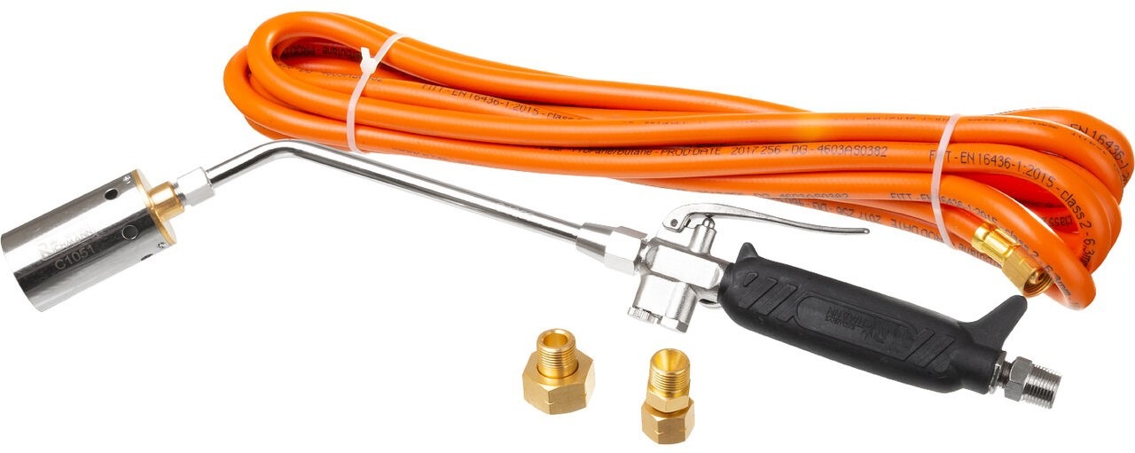 Setul arzator gaz include 1 arzator si 1 furtun 5 m, permite utilizarea arzatorului in locurile greu accesibile. Este echipat cu un maner ergonomic, prevazut cu un sistem de control al presiunii pentru a seta cu usurinta intensitatea dorita a flacarii.