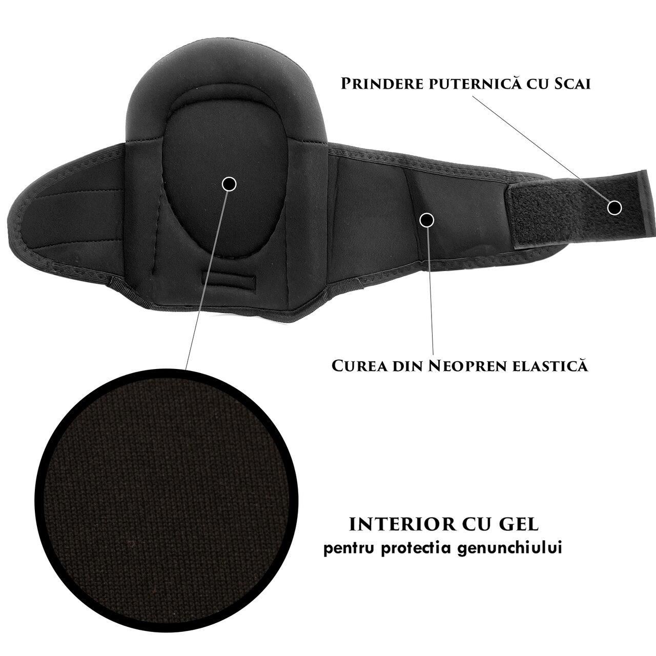 - Cureaua din neopren respirabil se fixeaza COMFORTABIL sub genunchi ajutand la diminuarea caldurii fiind cu inchidere RAPIDA cu scai de marime universala.