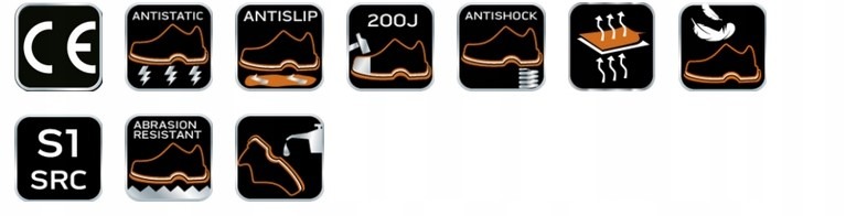 - Clasa de protectie: S1 (bombeu rezistent la impact, talpa anti-derapanta, zona de acoperire a calcaiului inchisa, absorbtia energiei in zona calcaiului si proprietati antistatice)