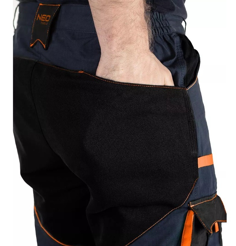 Pantalonii au un numar mare de buzunare incapatoare: un buzunar cu fermoar pe coapsa, buzunare la genunchi, buzunare la spate, dar si altele, prinse cu capse. In plus, sunt dotati si cu un suport pentru scule. Rezistenta lor este asigurata de cusaturi triple pe picioare si o potrivire foarte buna, realizata prin insertii cu talie elastica.