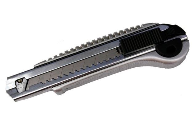 Cutit universal cu lame inlocuibile, corp din otel, maner din aluminiu cu material antiderapant, buton de blocare a lamei.