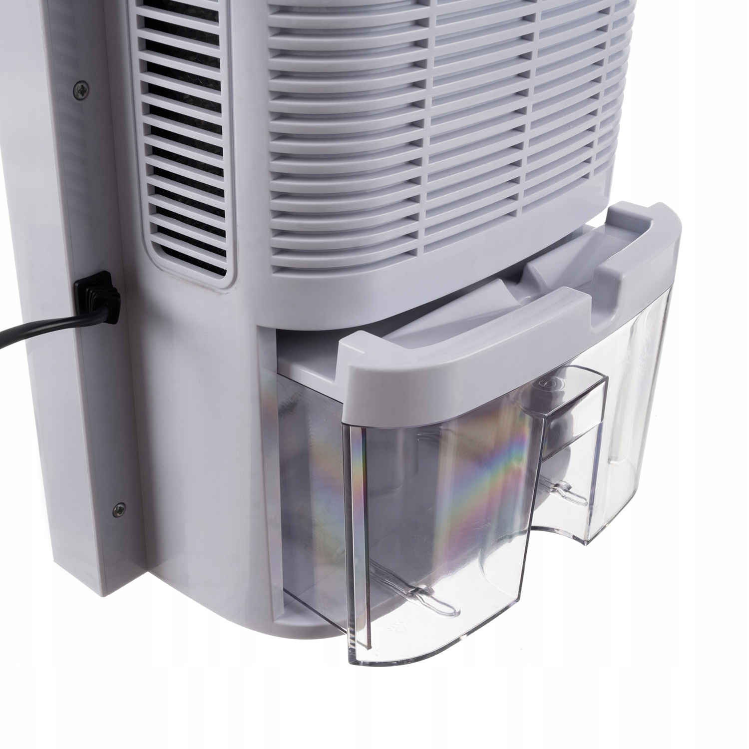 - Rezervorul dezumidificatorului are o capacitate de 1800 ml. Datorita acestui aspect, nu trebuie sa turnati apa foarte frecvent pentru a-l intretine. Puteti lasa cu usurinta dezumidificatorul acasa mai mult de doua zile! Un avantaj suplimentar al dispozitivului este oprirea automata dupa umplerea rezervorului. Setul include, de asemenea, un furtun pe care il puteti conecta la dezumidificator pentru a duce apa afara, de exemplu direct la chiuveta. Aceasta solutie va permite sa lasati dezumidificatorul inclusiv intr-un loc pe care il vizitati rar.