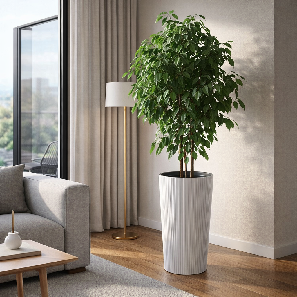 - Acest ghiveci elegant, de culoare alba, ofera oricarui spatiu interior sau exterior un aspect modern. Corpul sau cilindric, inalt, nervurile fine si suprafata mata creeaza un aspect sofisticat care subliniaza frumusetea naturala a plantelor tale – de la suculente si pana la palmieri sau flori de interior elegante.