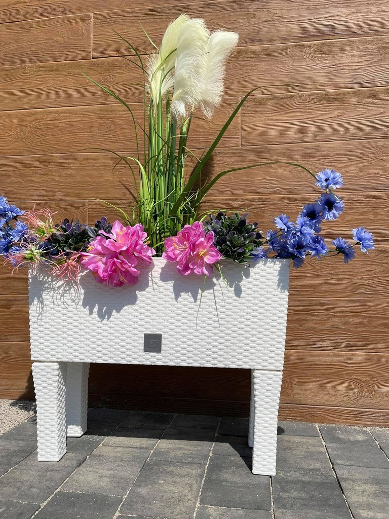 Jardiniera decorativa, cu picioare, sistem irigare, imitatie ratan, alb, 30 L, 60x25x46 cm, Rato Case High