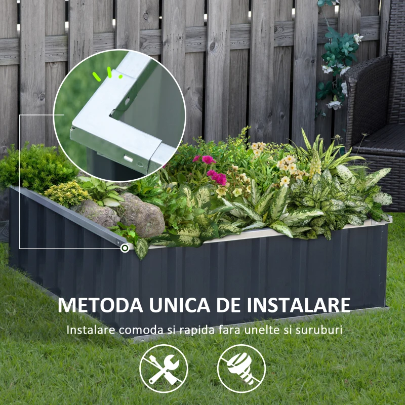 Acest pat înaltat vă permite să mențineți buruienile departe de plante, previne compactarea solului și asigură un drenaj eficient. Potrivit pentru colțurile grădinii, se montează ușor fără suruburi sau unelte.