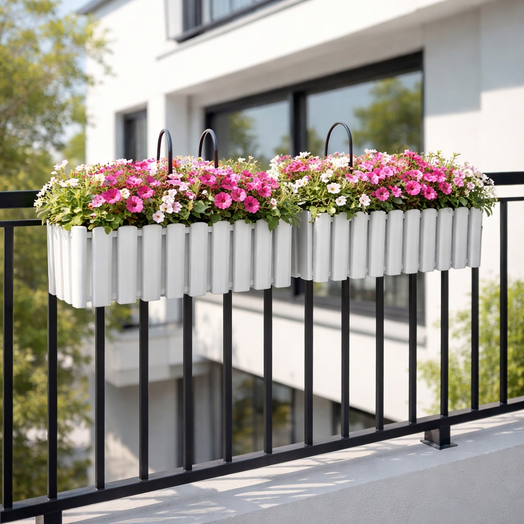 Fixare Solida pe Balustrada: Suportii metalici inclusi sunt discreti dar extrem de rezistenti, fiind proiectati sa sustina jardiniera in siguranta, indiferent de etajul la care este montata.