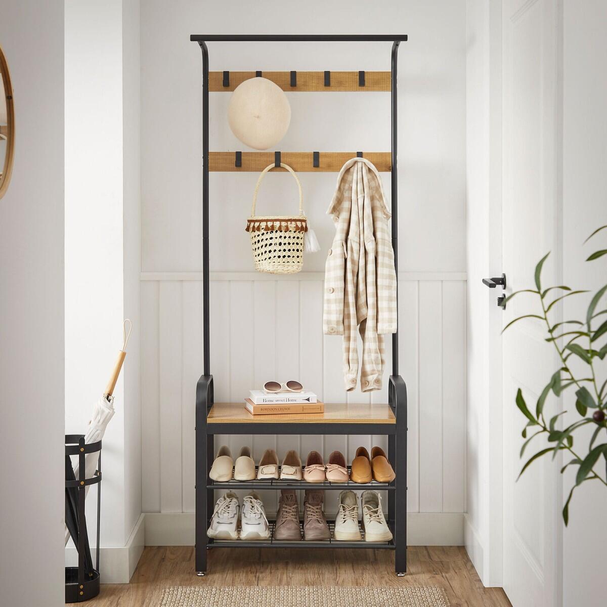 Cuier cu 2 rafturi pentru incaltaminte, Artool, banca, pal, otel, negru si natur, 72×33.7×183 cm