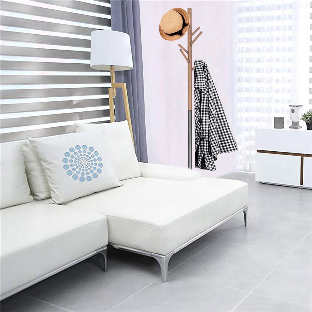 Cuier metalic design scandinav, 6 carlige, negru cu model lemn, baza metalica, 180 cm, Springos