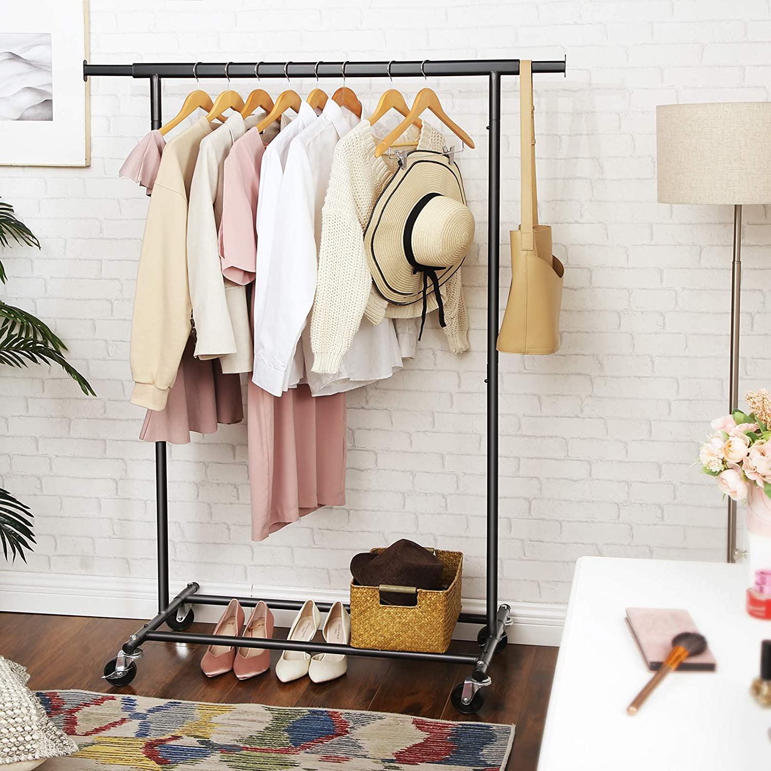 Suport mobil cu roti pentru haine, Songmics, reglabil, metal, negru, max 90 kg, 92×45.4×160 cm