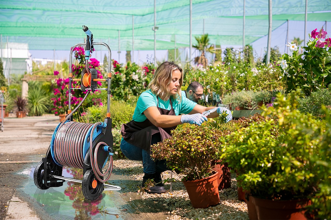 Furtunul de gradina vine la pachet cu un carucior pentru a facilita transportul acestuia si cu un pistol de stropit pentru gradina.