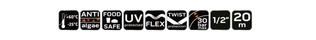Furtunul de gradina cu 6 straturi este fabricat din PVC flexibil, armat cu fire de poliester, cu doua impletituri (cruce si tricot). Este perfect pentru ingrijirea spatiilor de gradina mici si mari, inclusiv curatarea mobilierului si a instrumentelor utilizate in exterior, indiferent de anotimp. Furtunul este rezistent la depunerea algelor si la razele UV, fiind potrivit si pentru contactul cu alimentele datorita stratului Food Safe. Sistemul anti-rasucire il face confortabil de utilizat.