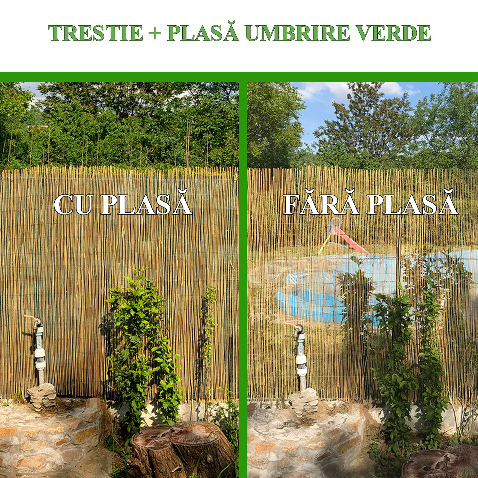 - Cu ajutorul acestui model de gard, aspectul general al curtii va fi unul tropical si va ajuta la crearea unei atmosfere naturale si intime, caci datorita lui folosit impreuna cu o plasa verde sau aplicat de doua –trei ori pe aceeasi suprafata pentru a fi mai des in anumite zone pot fi protejate si mascate sau camuflate de privirile indiscrete. De asemenea, aceste garduri din trestie sunt folosite pentru a ingradi, a umbri sau a decora anumite zone si spatii.