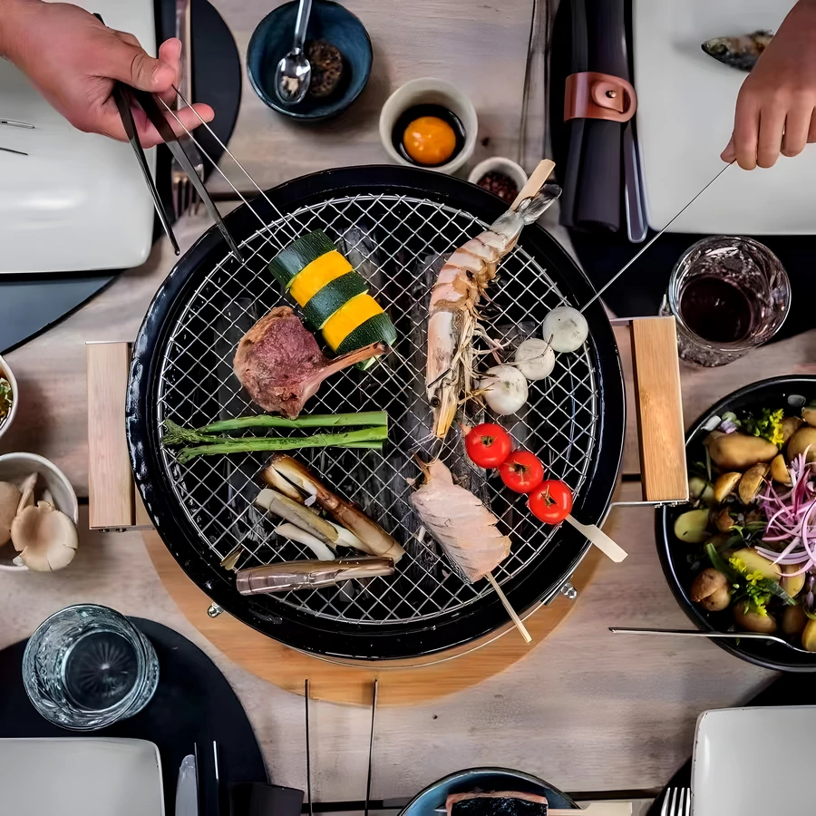 - Cu ajutorul sau se pot prepara o varietate de alimente delicioase, de la frigarui de carne si legume pana la peste, fructe de mare sau chiar felii subtiri de tofu marinat. Datorita suprafetei de inox care se incinge rapid si uniform, acest gratar este ideal pentru gatitul preparatelor de tip yakitori, kebab sau mici portii de carne fripta in stil asiatic. In plus, forma compacta si caldura concentrata permit rumenirea perfecta a alimentelor, pastrand aromele si suculenta, fara a fi nevoie de cantitati mari de carbune sau gaz.