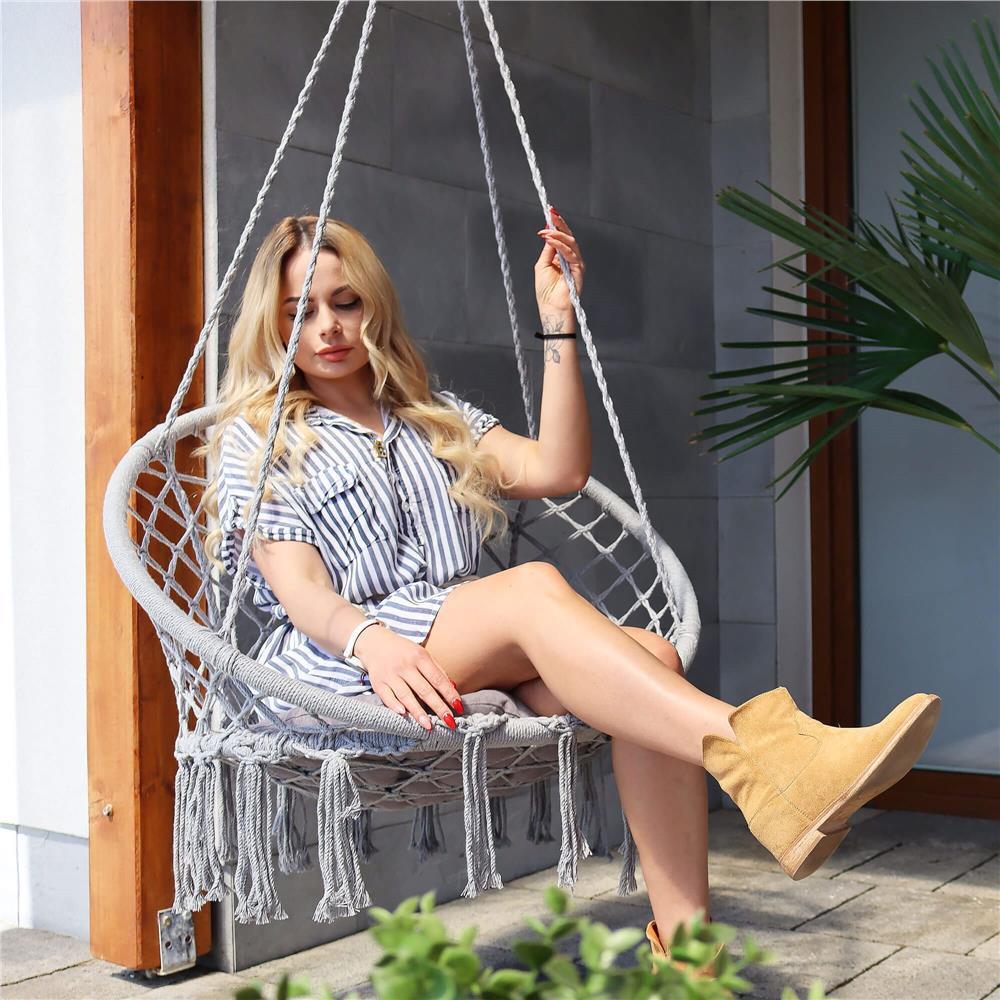 Franjuri la moda in stil boho, o culoare frumoasa si o tesatura din franghie confera leaganului suspendat un aspect uimitor. Corzile impletite estetic si cercurile groase acoperite cu acestea asigura durabilitate, confort si o constructie pe cat de usoara, pe atat de solida si rezistenta.