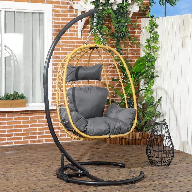 Scaun leagan suspendat, Wilona, ratan sintetic, galben si negru, perna gri, max 150 kg