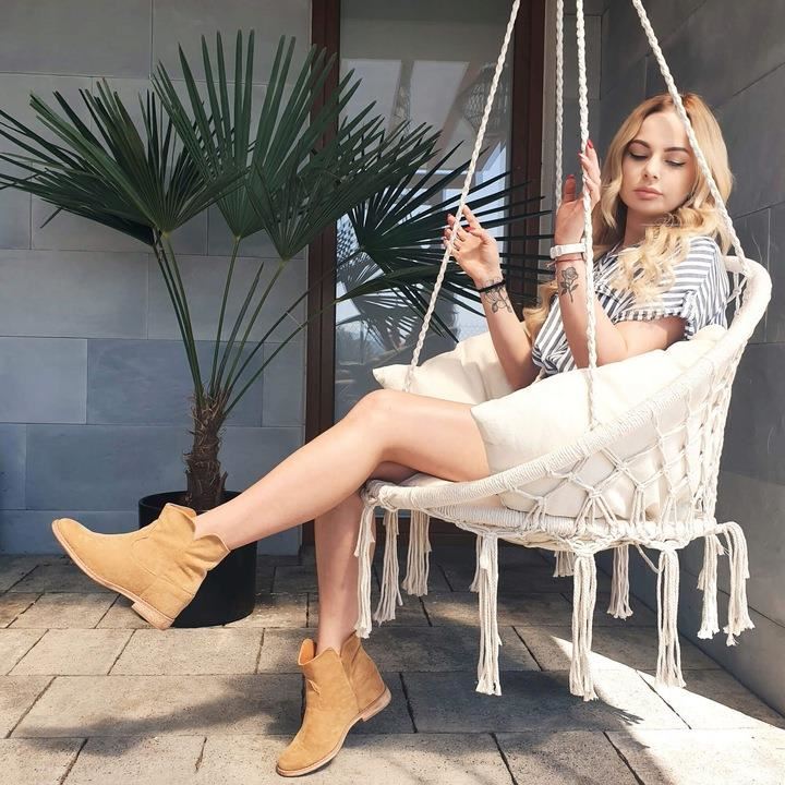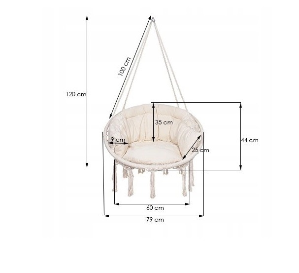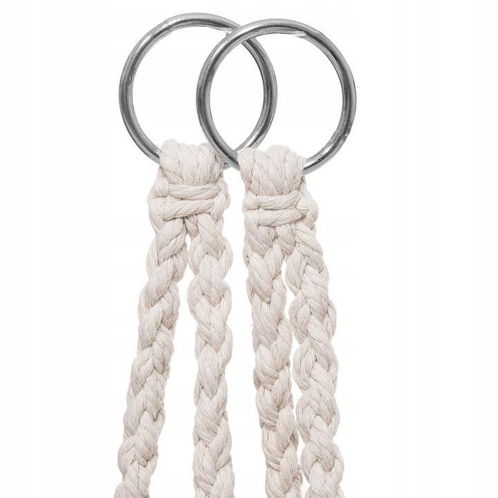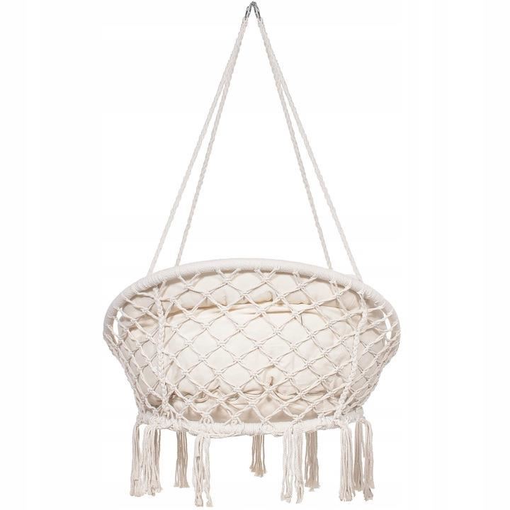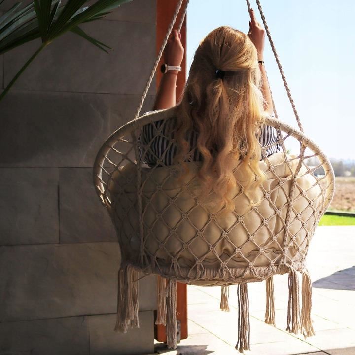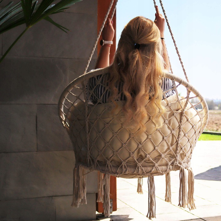 Franjurile la moda in stil boho, o culoare frumoasa si o tesatura de franghie ofera leaganului suspendat un aspect uimitor. Franghiile impletite si intreg designul asigura durabilitate si confort. O perna moale, mare, completeaza perfect ansamblul.