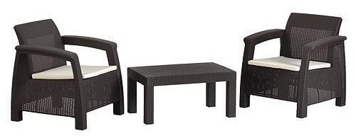 Culoarea mobilierului este maro inchis, care se potriveste perfect cu pernele bej incluse in set.