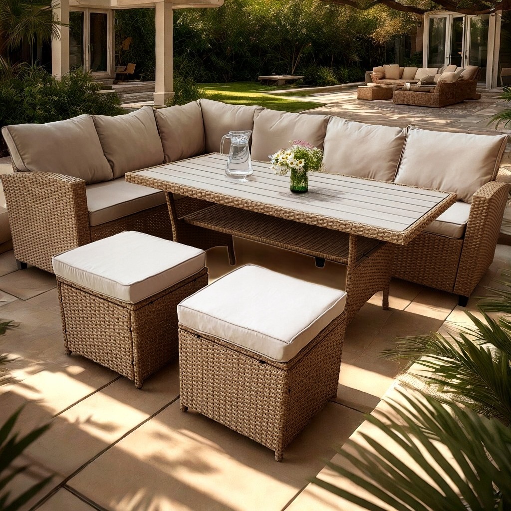 Set mobilier gradina/terasa, maro deschis si bej, ratan sintetic, 1 masa, 2 canapele, 2 tabureti, Cesme