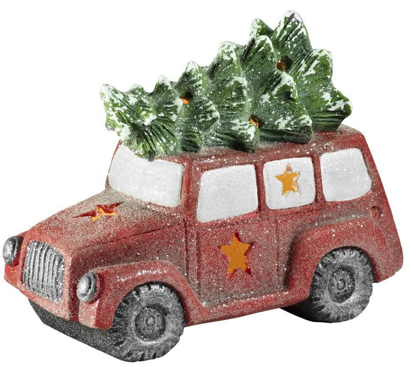 Decoratiune Craciun, ceramica, masina cu bradulet, LED, 3xAAA, 35x19x29 cm