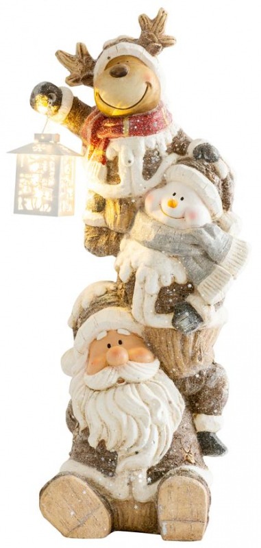 Decoratiune Craciun, ceramica, Mos Craciun cu ren si om de zapada cu felinar, LED, 2xAAA, 29x24x66 cm