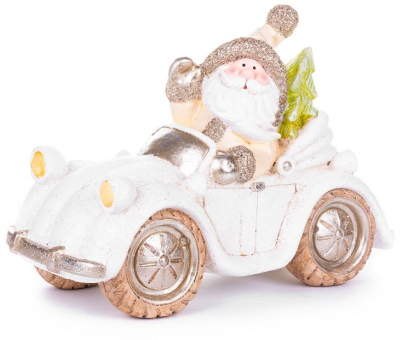 Decoratiune Craciun, ceramica, Mos Craciun in masina alba, 46.5×19.5×31.5 cm