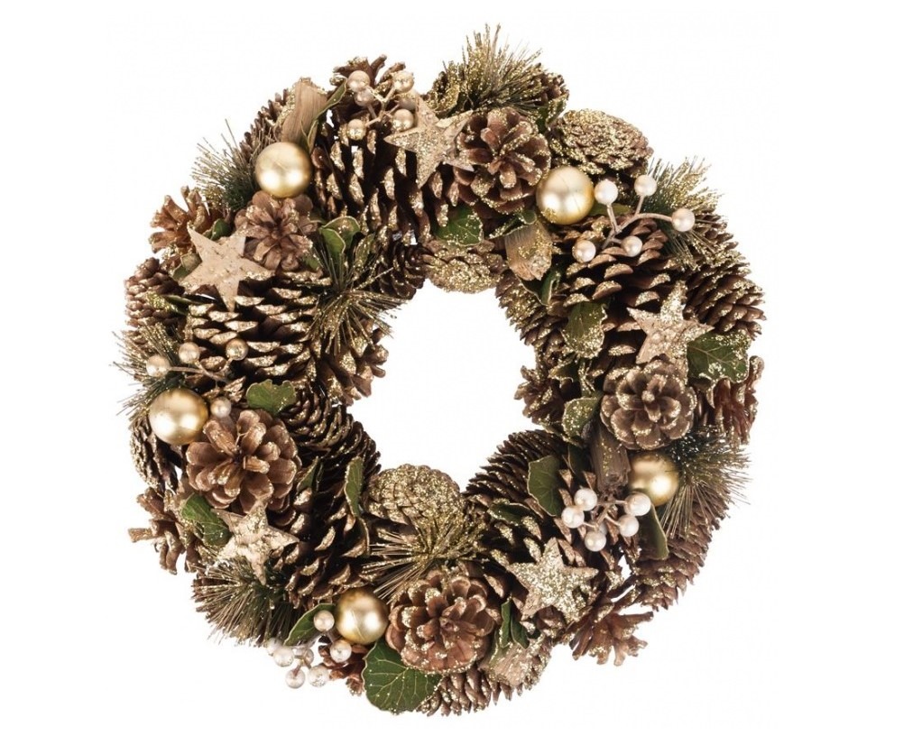 Decoratiune Craciun, coroana cu conuri si globuri, auriu, 34 cm