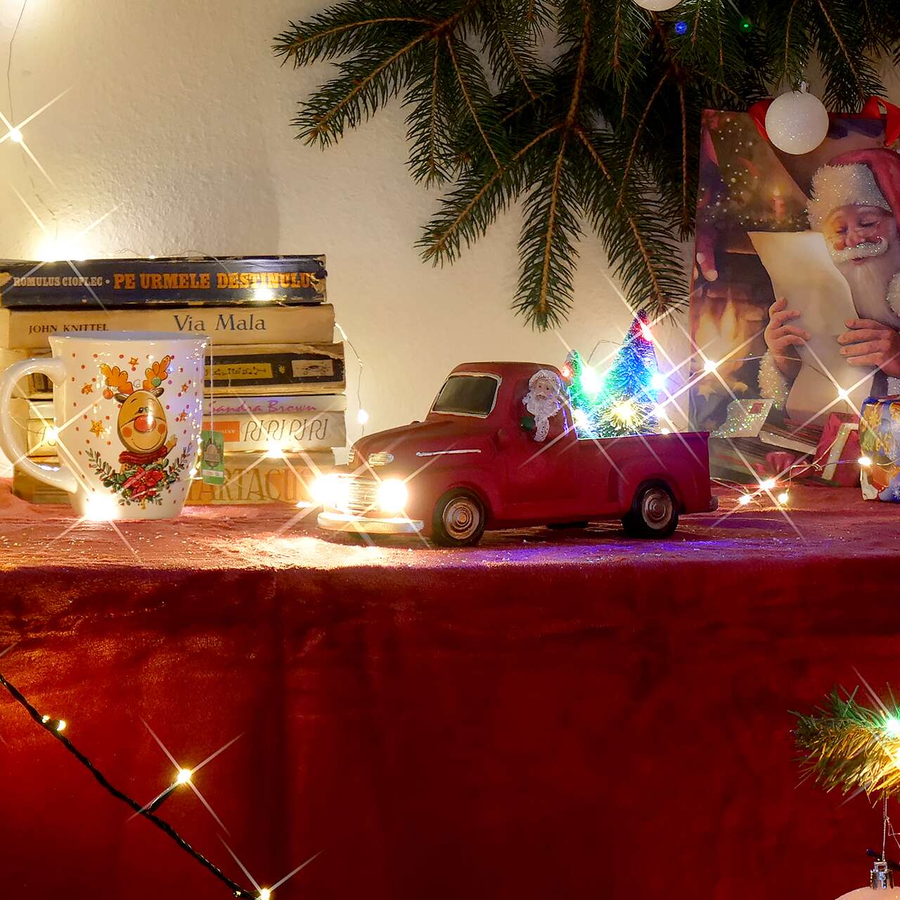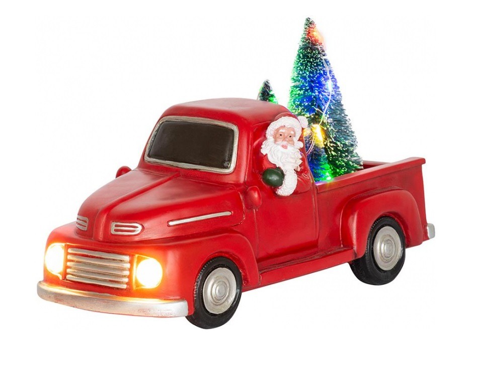 Decoratiune Craciun, polirasina, Mos Craciun in camioneta cu bradulet, LED, 11x24x11 cm, 3xAA, Magic Home