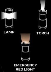 Are 3 functii de iluminare: lanterna, lampa si lumina rosie de avertizare.