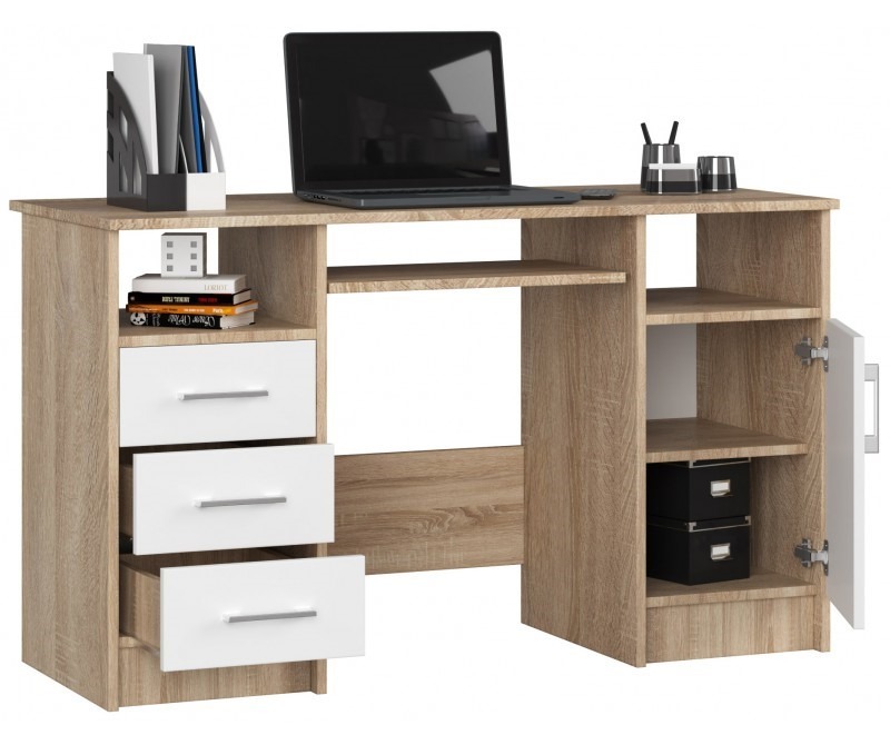 Birou calculator, placa laminata, 3 sertare, 5 rafturi, stejar si alb, 124x52x74 cm, Ana