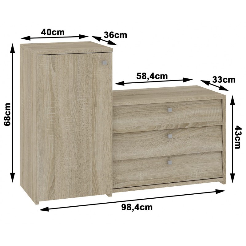 Dulap depozitat incaltaminte, pantofar, placa laminata, 3 sertare, 2 rafturi, stejar, 98.4x33x68/43 cm