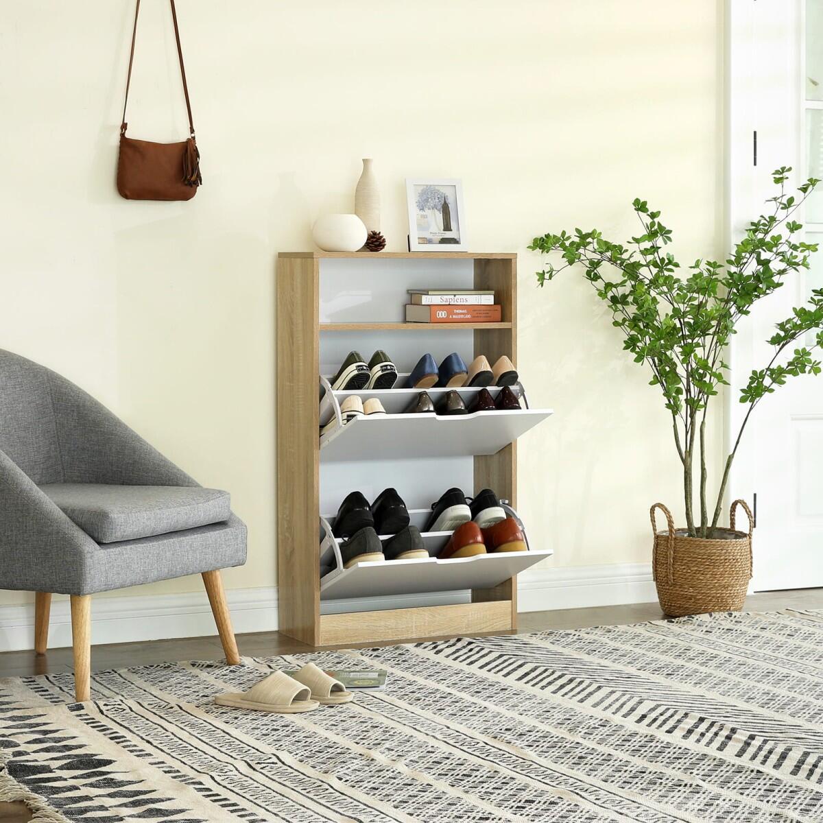 Dulap pentru depozitare incaltaminte, pantofar, Artool, pal, alb si stejar, 2 sertare, 1 raft, 60x24x102 cm