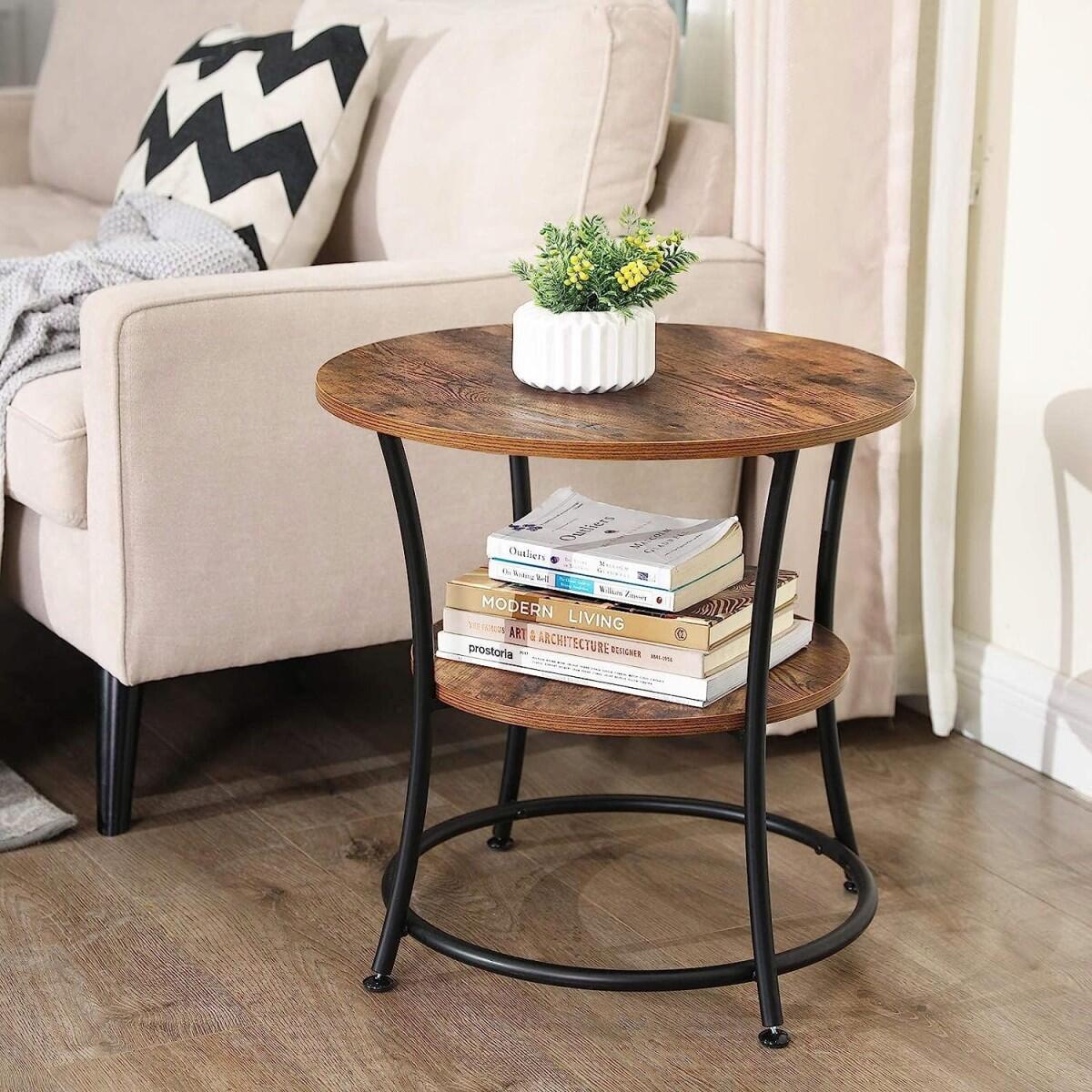 Masa pentru sufragerie/living, Artool, rotunda, pal, metal, cu raft depozitare, maro rustic si negru, 55×55 cm
